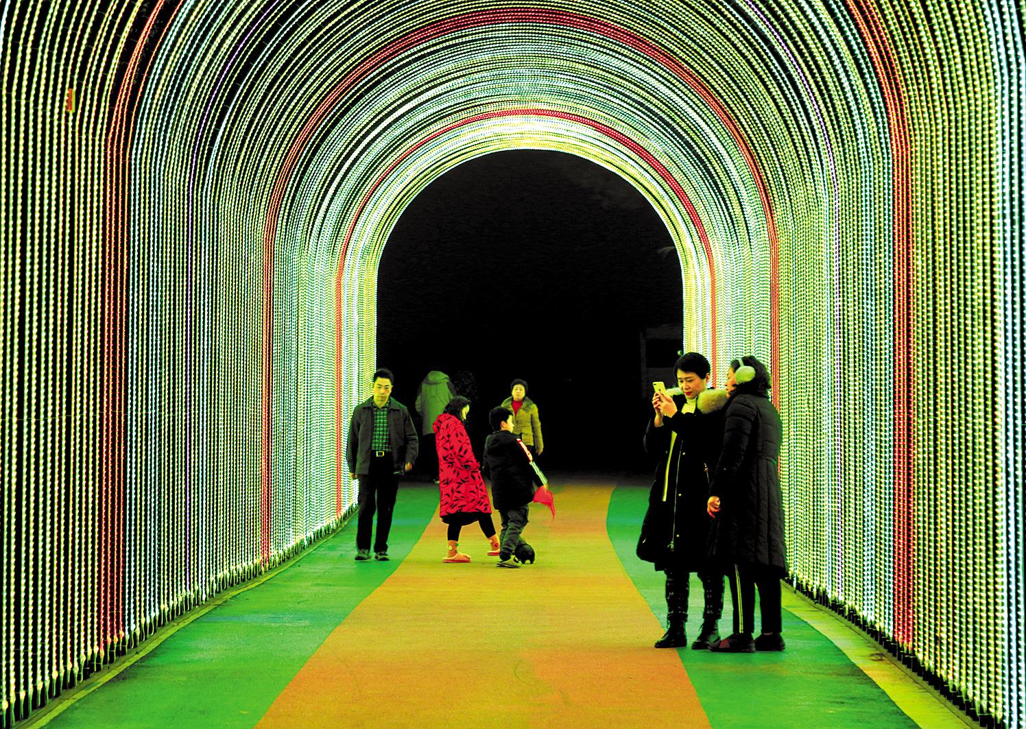 1月14日晚,市民和游客在恩施市凤凰山森林公园体验“时光隧道”。凤凰山森林公园50米长的“时光隧道”,各种色调的灯光交替闪烁,宛如星光密织,璀璨夺目,吸引了众多市民、游客前来体验打卡,领略流光溢彩的生态园林夜色之美。(视界网 谭华 摄)