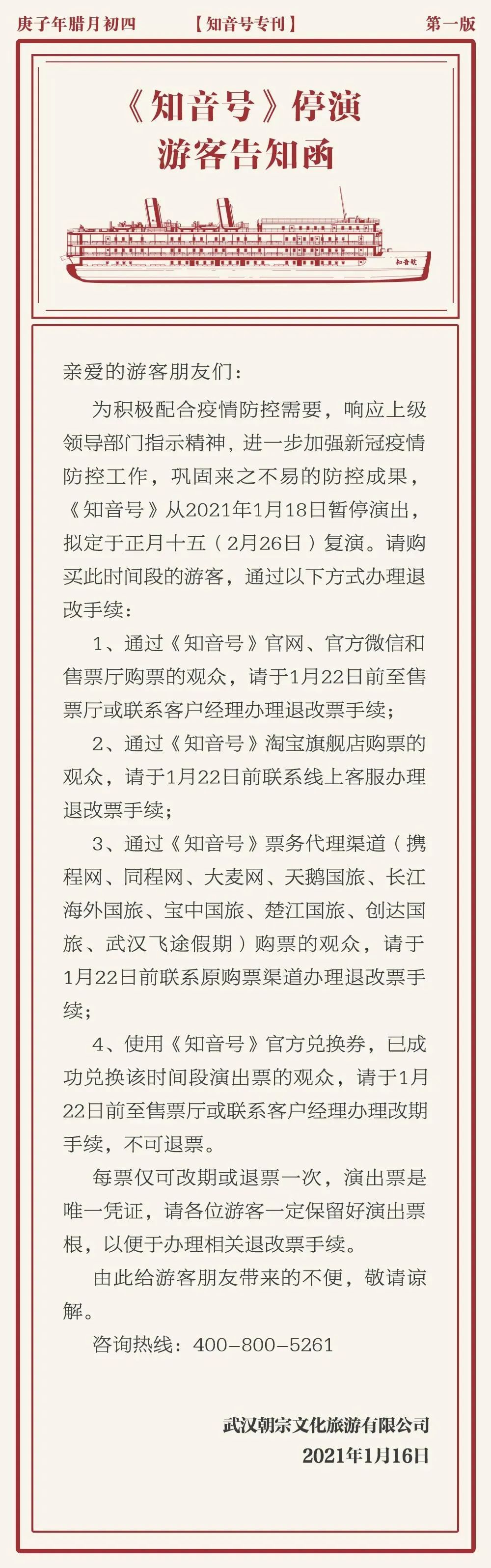 武汉人民艺术剧院1月15日发布了“部分演出项目停演公告”。公告说,为进一步落实武汉市新冠疫情防控工作的要求,全力做好防控工作,切实保障广大观众和市民的身体健康与生命安全,原定于2021年1月15日至31日在武汉人艺中南剧场进行的演出停演,通过大麦网及其他票务渠道购票的观众,请根据各票务平台的具体流程规则,进行退票退款。因停演造成的不便,敬请谅解。