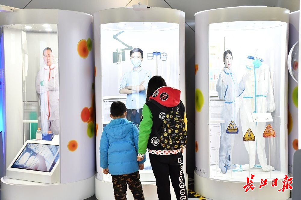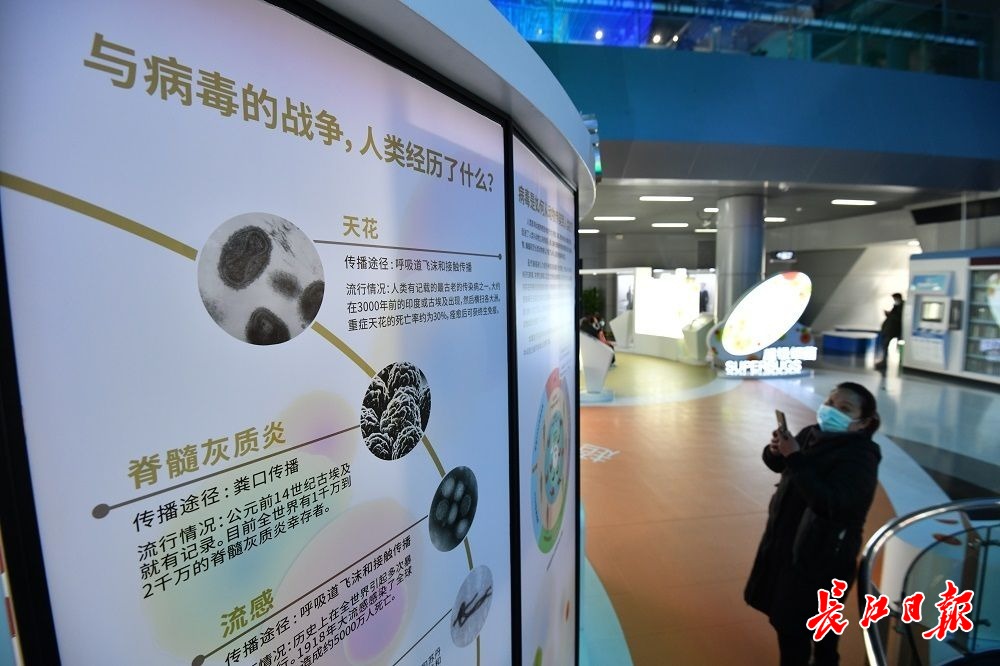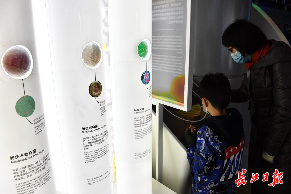 长江网1月16日讯1月16日,部分小学生们在父母的带领下来到武汉科学技术馆看展,展馆举办的《超级细菌:为我们的生命而战》巡展吸引了众多市民观看。