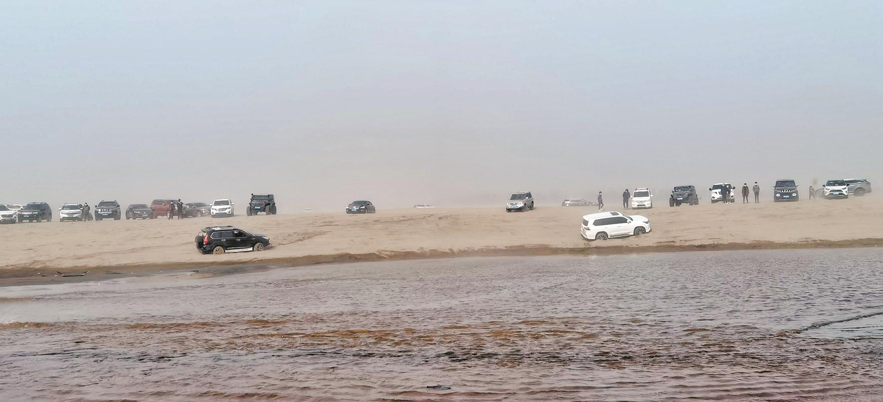 记者看到,沙滩上有多处坑洼,最大的一处坑洼中有不少积水。至昨日下午1时许,百余辆越野车在此扎堆,纷纷停放在这处水洼旁边的高处。