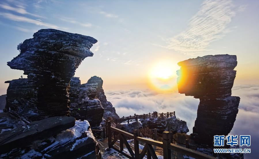 当日,雪后的世界自然遗产地梵净山在夕阳映照下,翻涌的云海呈现朦胧的玫瑰色,美若仙境。