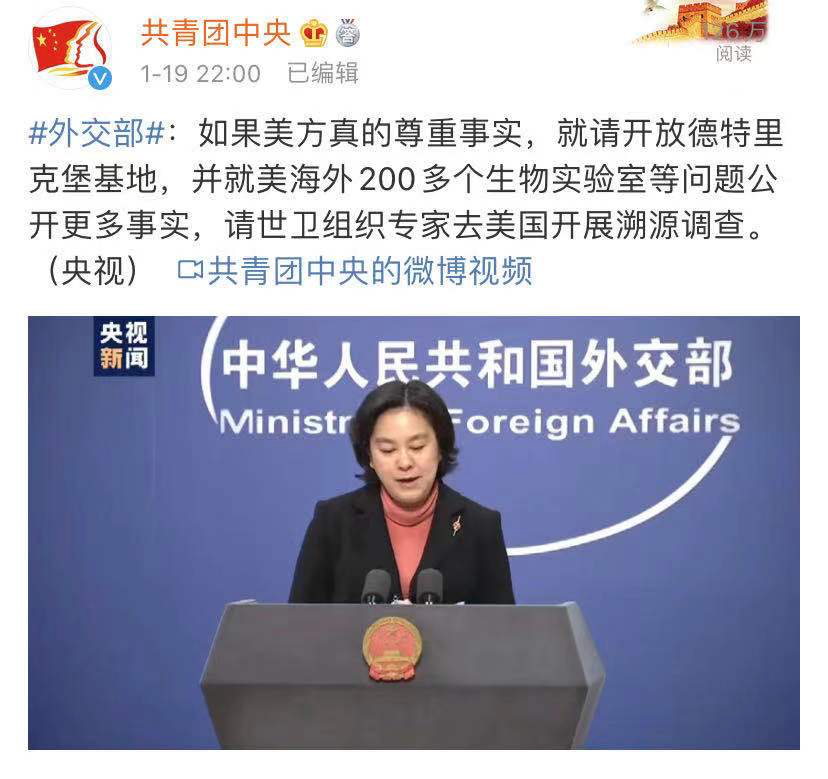 据外交部官网消息,1月18日,外交部发言人华春莹主持例行记者会。有记者提问,日前,美国国务卿蓬佩奥在国务院网站发表声明和事实清单,称其掌握中国政府实验室活动新信息,攻击中国阻碍病毒溯源和进行“虚假宣传”,指责武汉病毒研究所人为制造及泄露病毒,武汉病毒研究所同军方秘密合作等,强调必须对新冠病毒起源进行全面且不受限制的调查。请问中方有何评论?