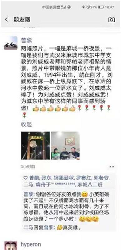 刘威威是湖北省武昌水果湖第二中学的一名老师,2020年前往麻城市城东中学支教。19日下午4点多,当天的教学任务完成后,刘威威像往常一样准备去健身房锻炼。“当时我经过东门大桥,看见桥上有二十多人围在一起,我当时就想,是不是有人落水了。”刘威威说。