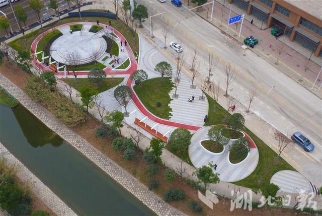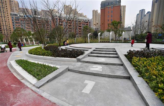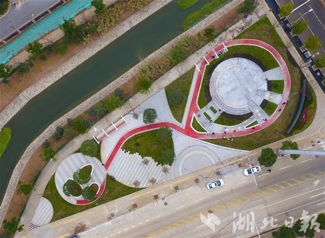 首座亮相的口袋公园位于武汉市江岸区健康街与华盛路交会处北侧,占地1684平方米,被4个居民小区环绕。该园紧临塔子湖明渠,水域与华盛路夹角的三角形地块被巧妙布局,划分为功能各不相同的“3个圈”。第一圈设有圆形广场,场地开阔可作为市民的活动空间。第二圈贯穿步道,既可作为通行区域,也可利用小型空地作为运动空间。第三圈由三个花坛构成,可供市民围坐,定位为休闲空间。公园内栽种有樱花、桂花、乌桕、香樟等植物,春赏樱花,秋观红叶、闻桂香,是周边居民休闲的好去处。