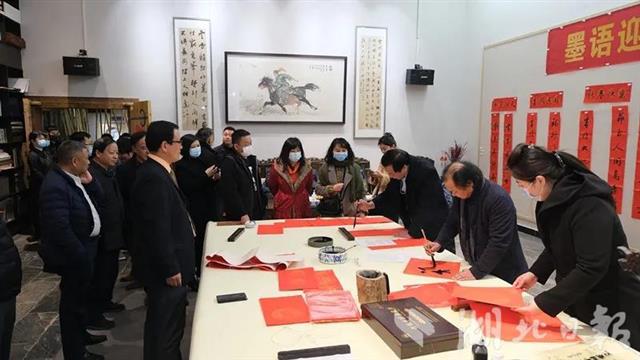魏金修、李乃蔚、郝孝飞、魏开功等参展艺术家参加现场活动,开幕式后,还进行了现场作画和写福写春联活动,书法家们创作了喜庆、吉祥的春联,画家魏金修和李乃蔚创作了国画《牧归图》。据了解,本次展览由书法报社和湖北省青年楚商协会共同协办,展览持续至3月17日。