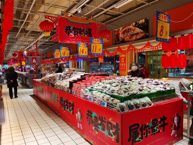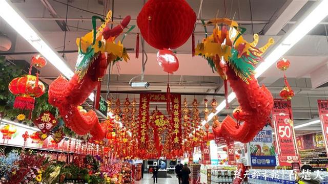 19日上午,记者在大润发江汉店看到,在火红过年装饰的装扮下,店内年味十足。