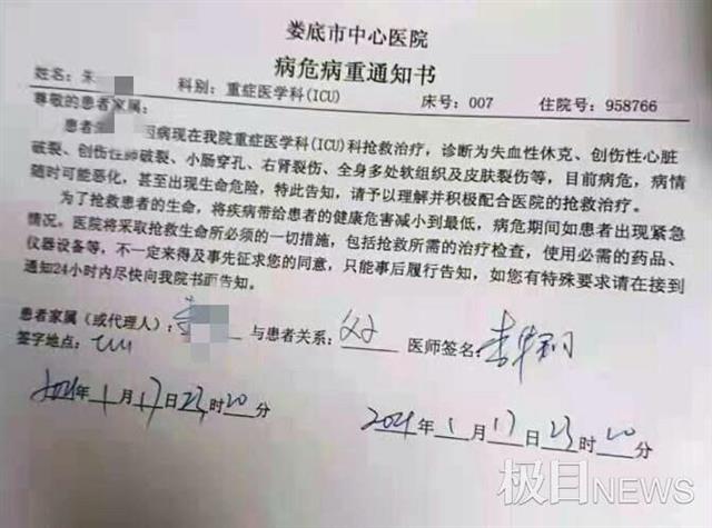 事发后,寒寒第一时间被送到了娄底市中心医院,一份医院出具的病危病重通知书显示,孩子被诊断为失血性休克、创伤性心脏破裂、小肠穿孔、右肾裂伤、全身多处软组织及皮肤裂伤等,目前病危,病情时可能恶化,甚至出现生命危险。