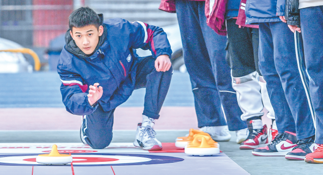 在武汉市第十五中学开展的是旱地冰壶,操场上铺有两张方形纸板作为冰壶赛道,两侧分别设有一个平面同心圆垒,从外到内呈蓝白红三色。选手以5人为一组,分红黄两队站在圆垒一侧,沿中线依次投掷冰壶,击到同心圆垒内得分。两队掷完8次后,场上冰壶距离红色同心圆最近的队获胜。学生们通力协作保护自己队的冰壶停在同心圆垒中,将对手的冰壶击出垒外……队员们一边为自己队呐喊加油,一边关注着赛道的情况,玩得不亦乐乎。
