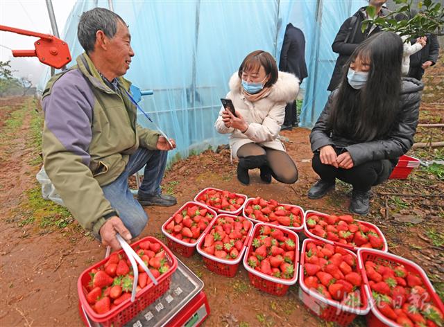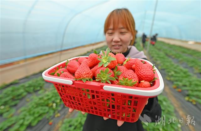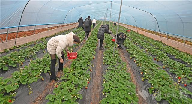 1月21日,宜昌城郊点军新村村民杨明信家的草莓大棚内春意盎然,不少游客慕名而来,在此采摘草莓,新建成的大棚种结出第一茬新果。2019年,点军区投资200万元,在城乡结合部的新村建设高标准的蔬果大棚,于去年6月建成现代化的农业种植大棚50亩,当地邀请在外的种植能人返村,带领村民采用“合作社+农户”模式运营。今年元旦后,草莓刚刚进入成熟期,每天都有宜昌城区的市民专程过来采摘,半个月的时间里,仅杨明信承包的草莓大棚已收入过万元,政府投入建设的大棚已经成为村民的的致富基地。(湖北日报全媒记者 刘曙松 通讯员 陈瑶 摄)
