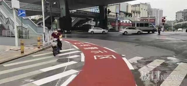 在对道路交通事故的成因分析中,大车转弯时有一个“内轮差”,同时大型车辆还存在着很多的视觉盲区,如果行人、非机动车离得太近是非常危险的,极易发生交通事故。而右转警示区的施划不仅提醒了行人非机动车,还提醒了大车驾驶员。江汉区市民陈先生说:一小块红色区域的提示,却为市民出行上了双保险,非常棒!”