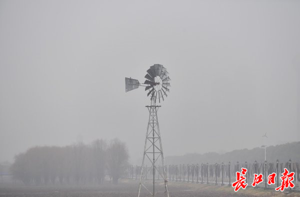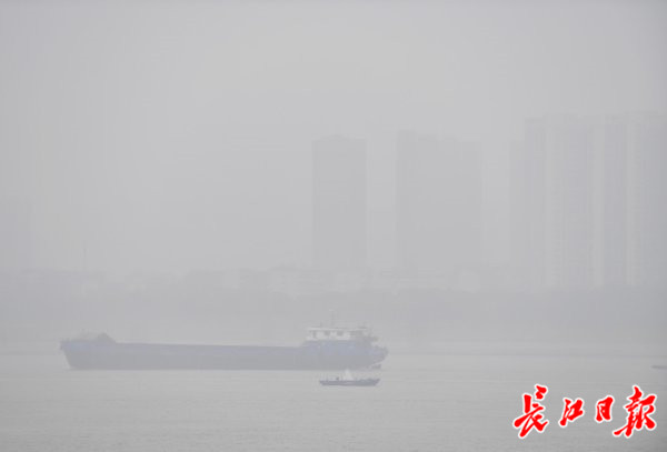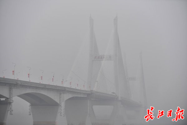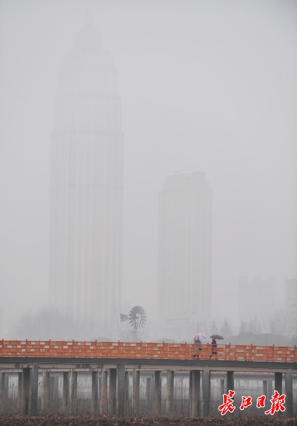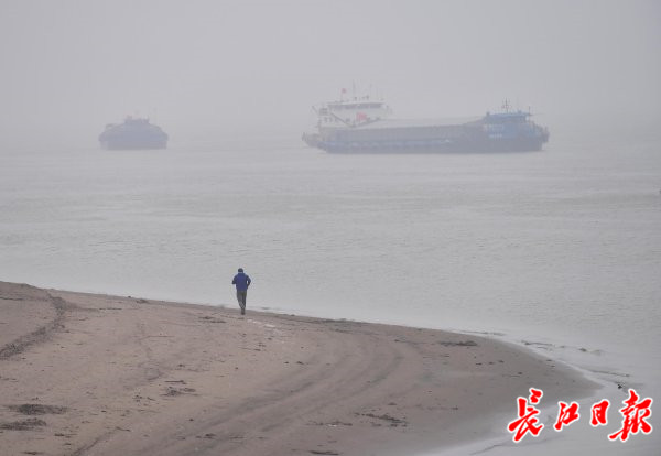 1月25日,风雨沥沥,雾霭迷蒙。汉口江滩,水天一色,长江二桥和江面的行船犹如飘浮在空中。有市民冒细雨在江滩上跑步,在栈桥上欣赏雨雾中的茫茫江景。
