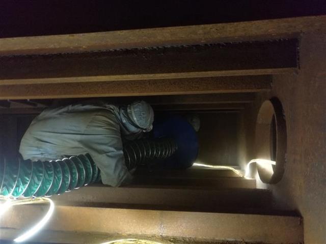 中山舰博物馆陈列保管与学术研究部主任黄文建介绍,此次维修加固工程主要分为“开孔通风”“排水清渣”“除锈加固”“内外涂装”四个阶段。此次工程在承台内外开割通风孔100处、施工维修孔26处及施工应急孔25处,并在承台内部增设通风机32台,加强承重台内部空气循环。经勘测核算,承重台内部共132个舱段,需除锈面积约为4500平方米。为了施工人员安全,在实际工作中,舱内操作人员全程佩戴安全护具,舱外设安全员陪伴,随时用绳索沟通提醒。本次工程内部涂装约4500平方米,外部涂装约900平方米。因承重台内部高度约0.7米,且被分隔成132个狭小舱段,施工人员不论是排水清渣还是除锈喷漆,都只能在内部爬行,作业时匍匐和仰躺施工,为防粉尘和油漆,还需穿保护服,佩戴防毒面具。