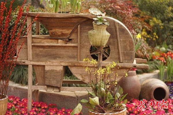 记者发现,立体花坛里还点缀有近十株菜薹和几盆小白菜,和各路花儿同台竞艳,不仅毫不逊色,还给整体效果增添了几分朴素可爱。仔细一看,有些花居然种在鱼篓、簸箕、石磨盘等农具里,别具一格。