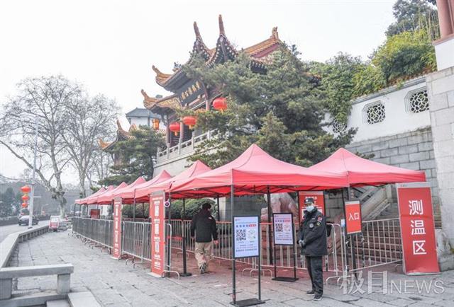 1月26日,极目新闻在黄鹤楼公园几处进园处看到,公园已经重新规划了入园区域,优化入园流程,并购置配备了红外测温仪,在各门口设置了测温区、初核区、核销区,引导游客依次按区域顺利入园。同时,对入园的游客,严格执行健康码扫码和体温测量,游客体温检测正常方可入园。