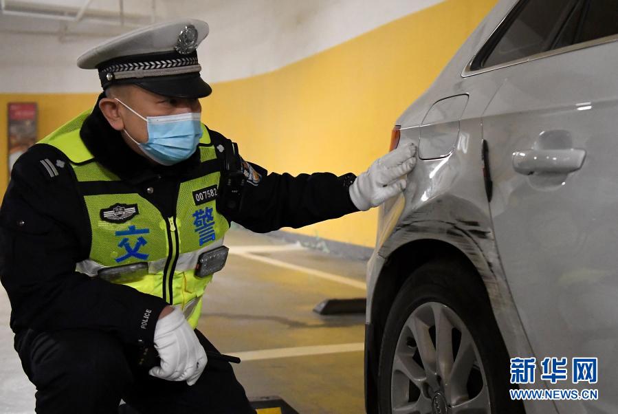 郑州市公安局交通警察支队第六大队夜巡中队中队长王兵在勘查事故现场(1月25日摄)。新华社记者李嘉南摄
