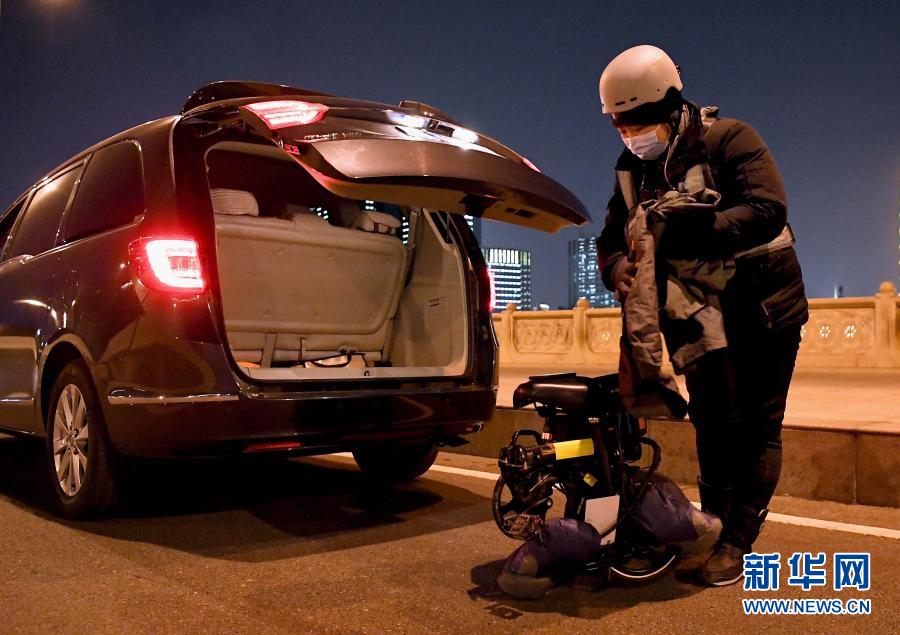 代驾师傅惠兰芳从客户车上搬下自己的电动车(1月18日摄)。新华社记者李嘉南摄