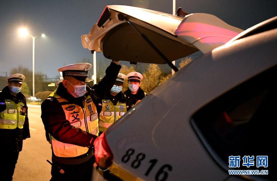 郑州市公安局交通警察支队第六大队夜巡中队中队长王兵在夜查酒驾(1月25日摄)。新华社记者李嘉南摄