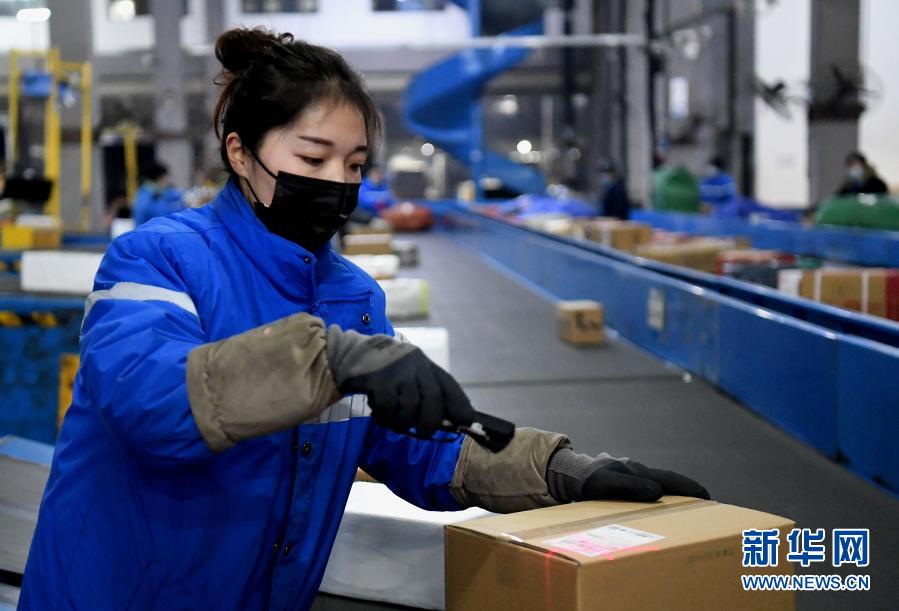 快递分拣员王书玲在中通快递河南公司郑州分拨中心码放快递(1月21日摄)。新华社记者李安摄