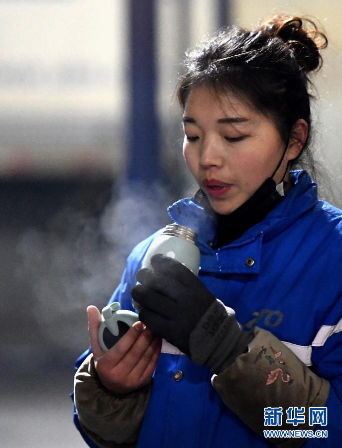 在中通快递河南公司郑州分拨中心,快递分拣员王书玲在工作间隙喝水(1月21日摄)。新华社记者李安摄