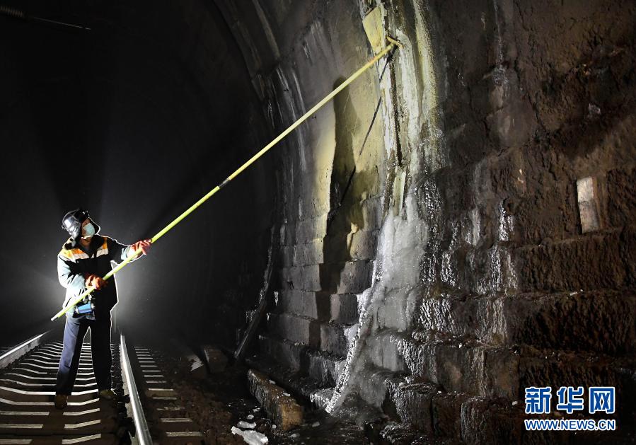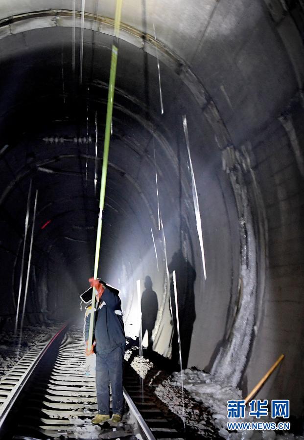 中国铁路郑州局集团有限公司洛阳供电段三门峡接触网维修工区工长郭振中在观音堂隧道内使用打冰杆清除隧道壁的冰柱(1月12日摄)。新华社记者李安摄