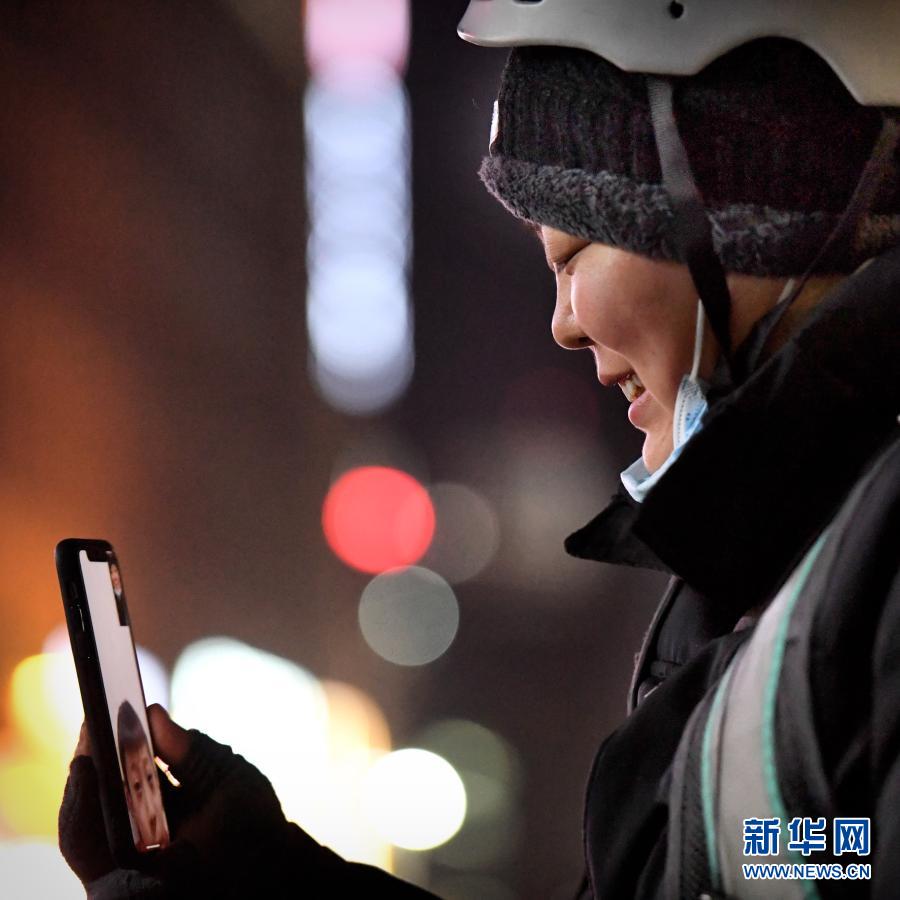 在郑州市的一家饭店外,代驾师傅惠兰芳在等单的时候和儿子视频通话(1月18日摄)。新华社记者李安摄
