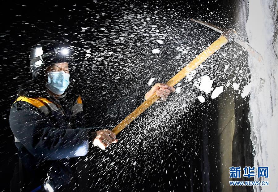 洛阳供电段和工务段在观音堂隧道进行联合打冰作业,郭振中在帮忙清除隧道壁的冰柱(1月12日摄)。郭振中是中国铁路郑州局集团有限公司洛阳供电段三门峡接触网维修工区工长,每年11月15日至次年3月15日,他都要穿梭于陇海铁路观音堂隧道清除冰害,确保列车行车安全。