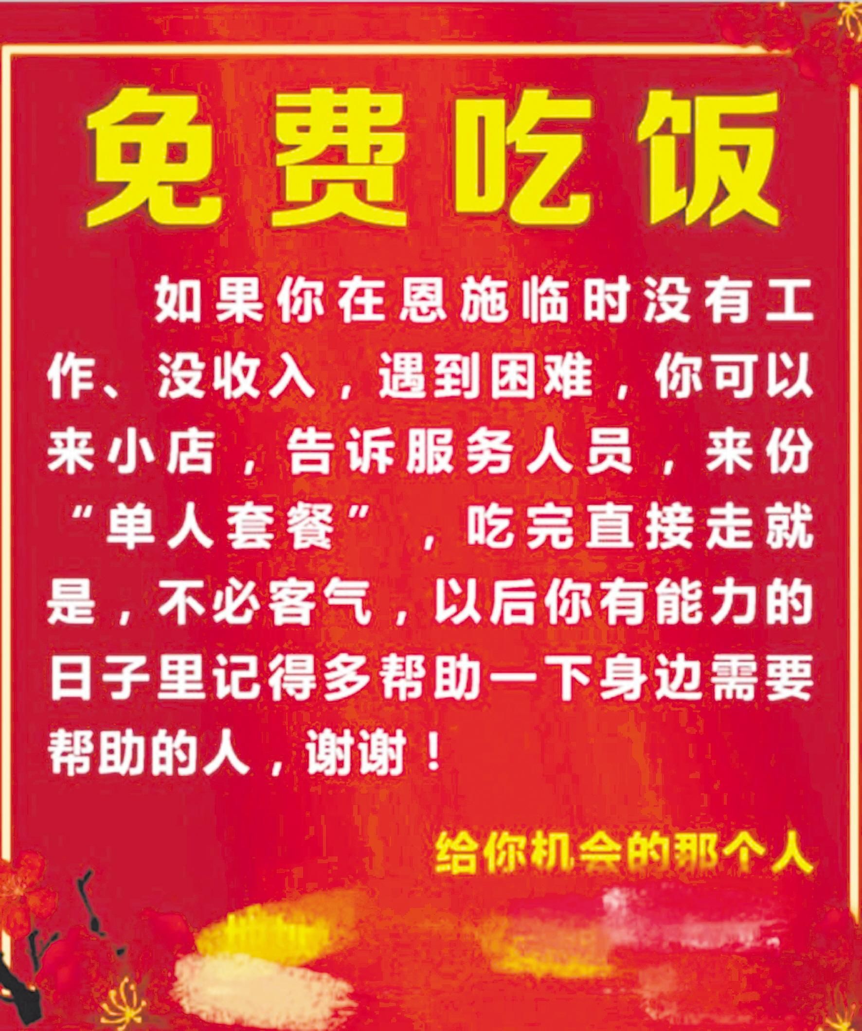 爱心餐食的红色告示牌格外醒目:“如果你在恩施临时没有工作、没收入,遇到困难,你可以来小店,告诉服务员,来一份‘单人套餐’,吃完直接走就是,不必客气,以后你有能力的日子里记得多帮助一下身边需要帮助的人,谢谢!”署名——给你机会的那个人。