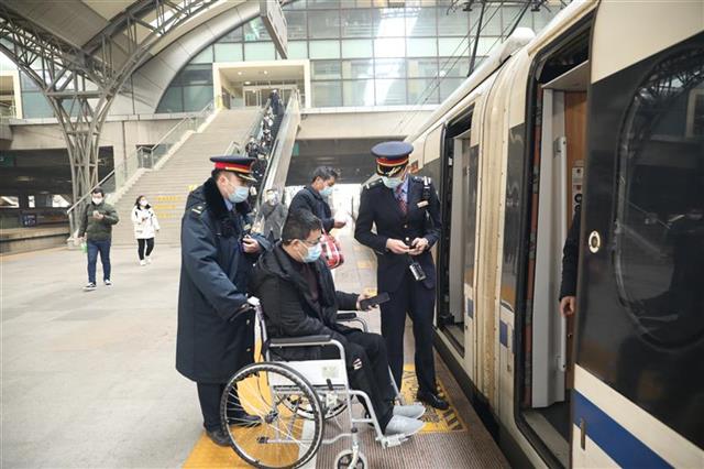 10时许,68岁的黄玉荣和老伴从武汉站开设的老人专用通道进站,准备坐火车到广州和儿子一家过年。“儿子就地过年不能回武汉,只有我们去看他了。”黄玉荣说。到广州北的高铁临时停运,工作人员况才咏带他们通过老年人专用通道办理改签。“人工通道就是好,方便不会扫码和网上购票的老人出行。”黄玉荣高兴地说。