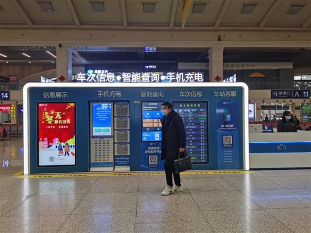 在汉口站,“心连心”服务台被搬到了站前广场上、候车室内的自助服务机旁,也设置了柜台,“我们把服务前移,希望进一步服务旅客。”戴丽芬介绍,汉口站候车室内增加了11个自助查询等智能化设备,提供免费充电和信息查询等服务。轻点屏幕,报销凭证打印机、厕所、手纸等信息一目了然。