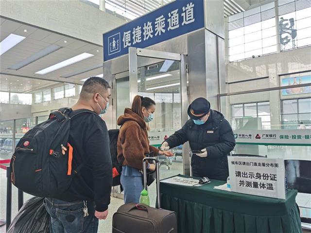 省客集团要求,体温异常、无健康码及没有佩戴口罩人员禁止进入车站。所有进站人员做到体温必测、扫码必做、口罩必戴、行程码必查。建立发热乘客登记报告制度,进站旅客保持一米距离排队进站,组织旅客安全、有序排队上车。