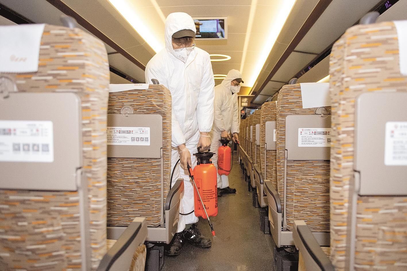 1月28日,在武汉动车段,工作人员正在车厢内对卫生死角及地面进行消杀。 (湖北日报全媒记者 何宇欣 通讯员 李磊 实习生 胡宇韬 摄)