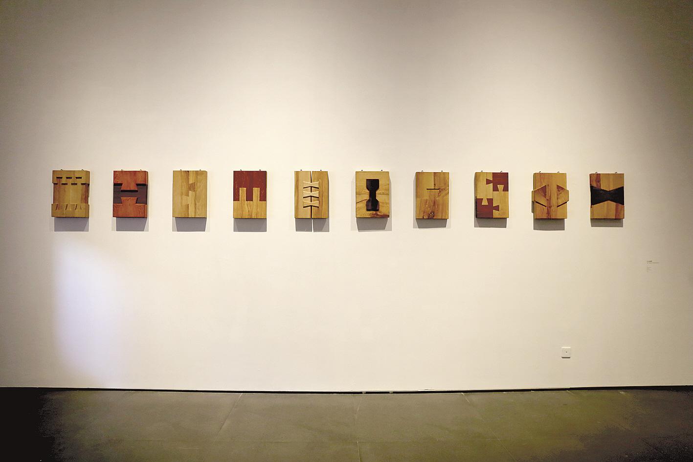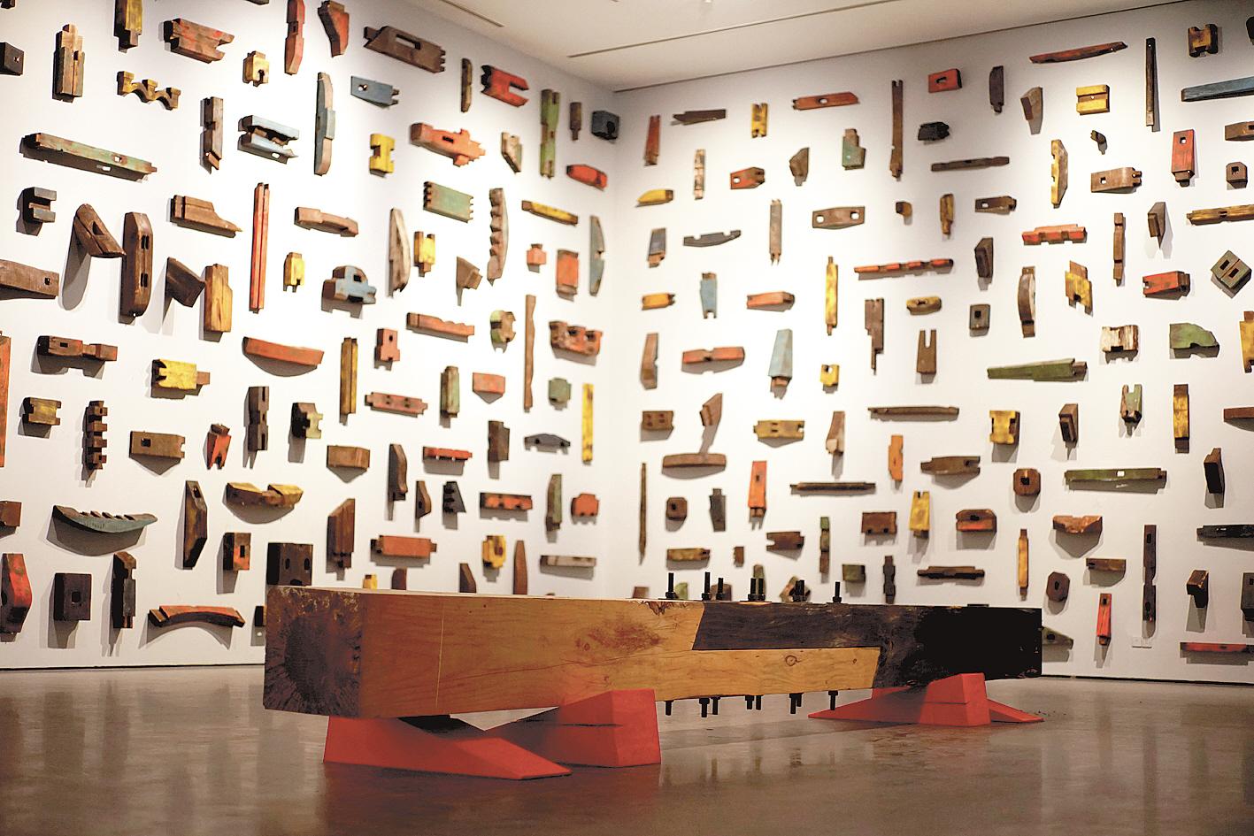合美术馆二号展厅展出了一件名为《大木作》的作品,整整铺满三面墙壁,一百多种榫卯构件,从历史深处走入观众视野。“如果没有榫卯,古代建筑、家具、工具,都将不能存在。榫卯结构,其实是中国古代建筑文化、造物文化的DNA。”傅中望说:“我想营造一个能容纳中国几千年木结构文化的气场,让观众感受我们民族的生存方式、生活方式。”