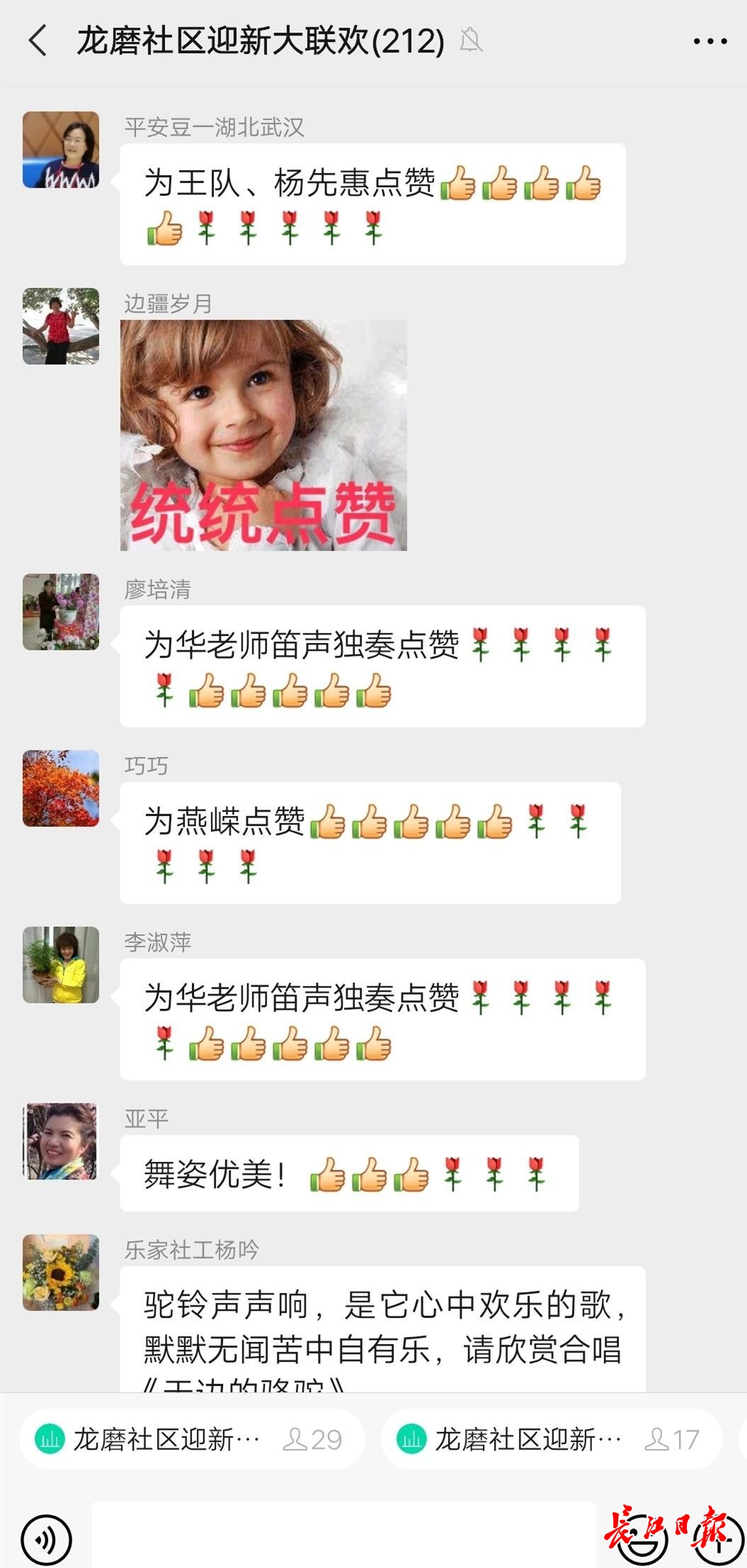 “大家虽然没有见面,但文字、视频和语音把大家紧紧联系在了一起。”社区书记杨黎告诉长江日报-长江网记者,社区有7000余人,其中外地来汉居民近一半。以前社区每年这个时候都会组织居民自己组织举办迎春联欢会,今年考虑到疫情防控,社区就把联欢会搬到了微信群,带给居民一个不一样的“迎新”方式,增加居民日常生活娱乐之余,让决定留汉过年的外地居民充分感受社区关心。