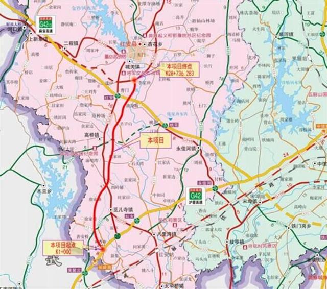 沪蓉高速红安联络线(武汉至红安高速公路)起于红安县觅儿寺镇新型产业园西侧的陈家田附近,与沪蓉高速相接,经高桥东、汪家湾,在刘家塝与麻安高速相交,止于红安县城区云台村,与该县发展大道相接。全线双向四车道,设计时速100公里,路基宽度26米,项目设置互通式立交交叉3处(觅儿西枢纽互通、红安南枢纽互通、高桥互通),设置养护工区1处、收费管理站2处等,路线全长约27.7公里。