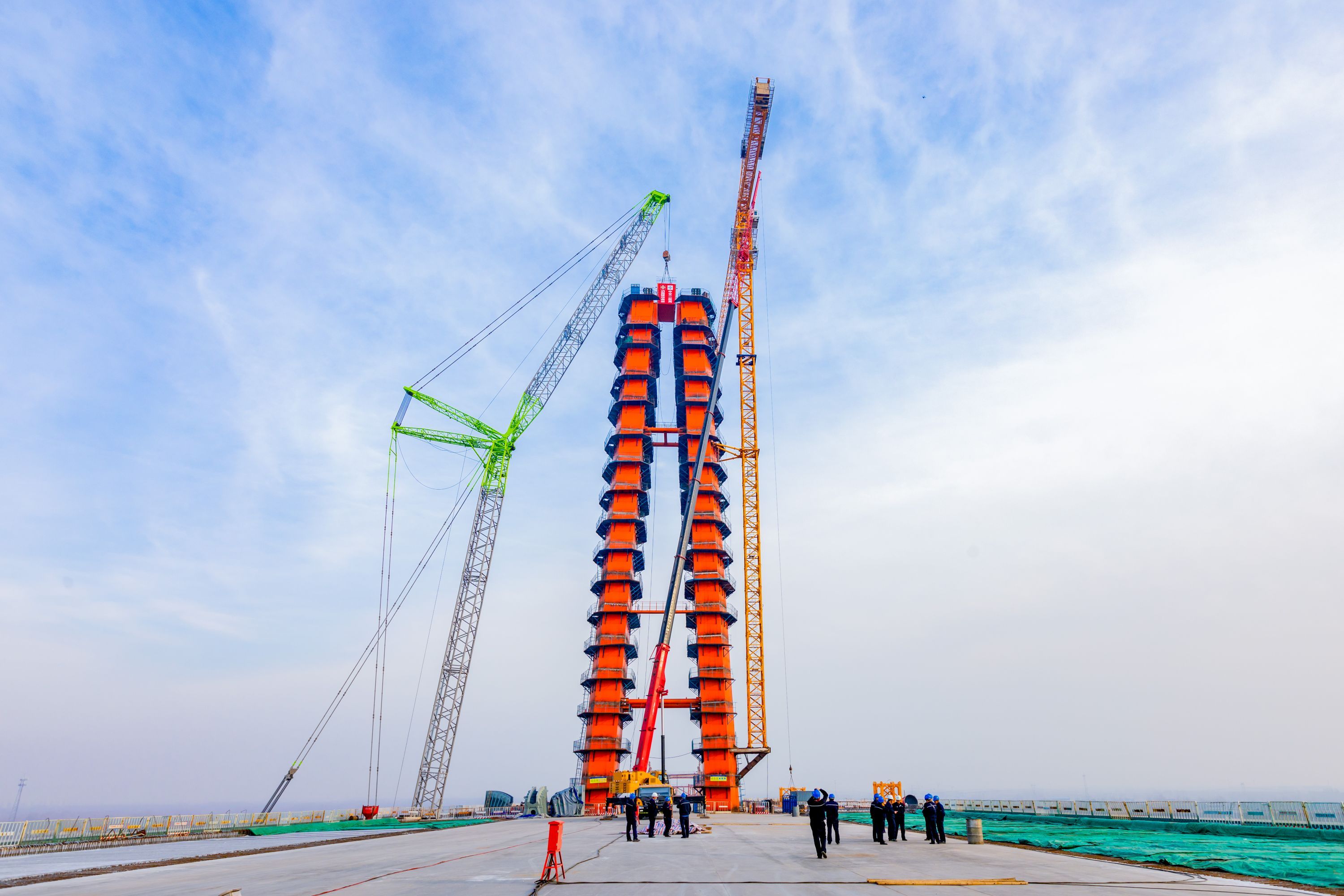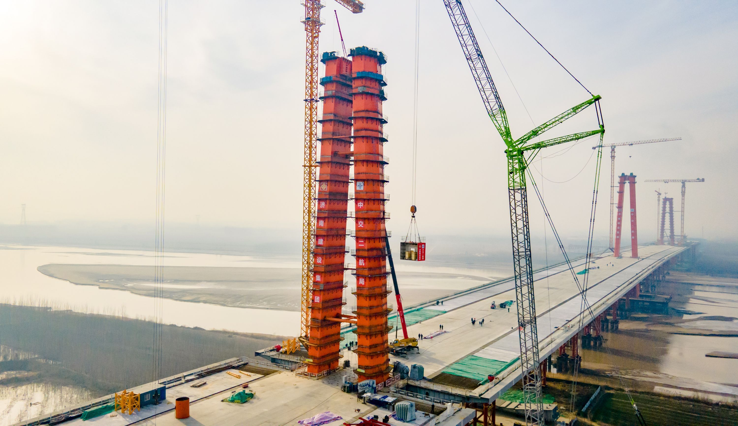 大桥三座主塔均为钢结构A型塔,采用五边形单箱三室截面。其中,中塔高126米,边塔高116.1米,塔柱标准节段高度为4米,节段最重约90.5吨,节段间采用全焊接结构形式。