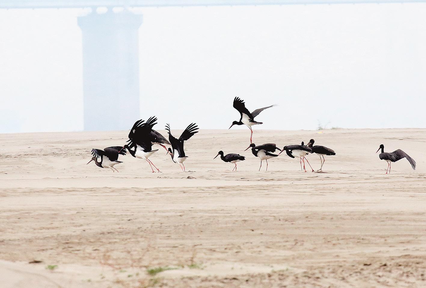 黑鹳种群在武汉天兴洲越冬栖息。(武汉市观鸟协会供图)