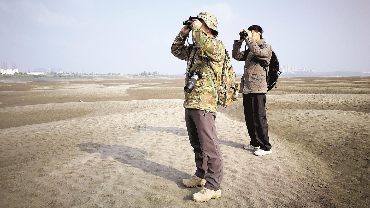 志愿者在洲头沙滩开展黑鹳保护巡护。 (武汉市观鸟协会供图)