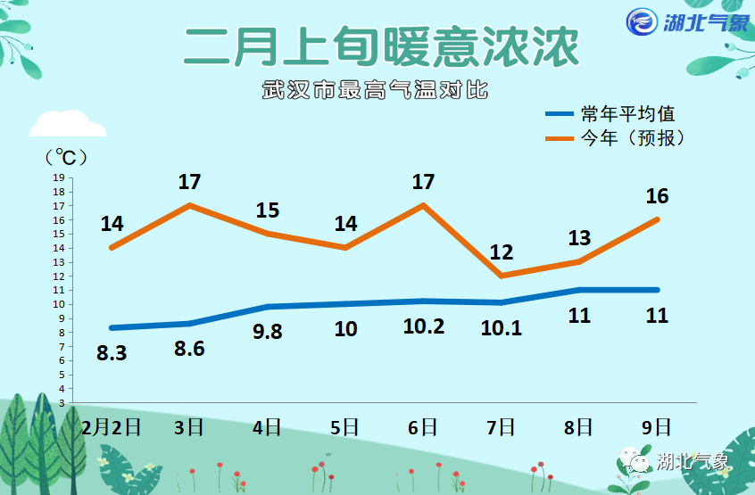 来自“湖北气象”官微信息,根据今年的天气预报,今年2月上旬武汉将会暖意浓浓。