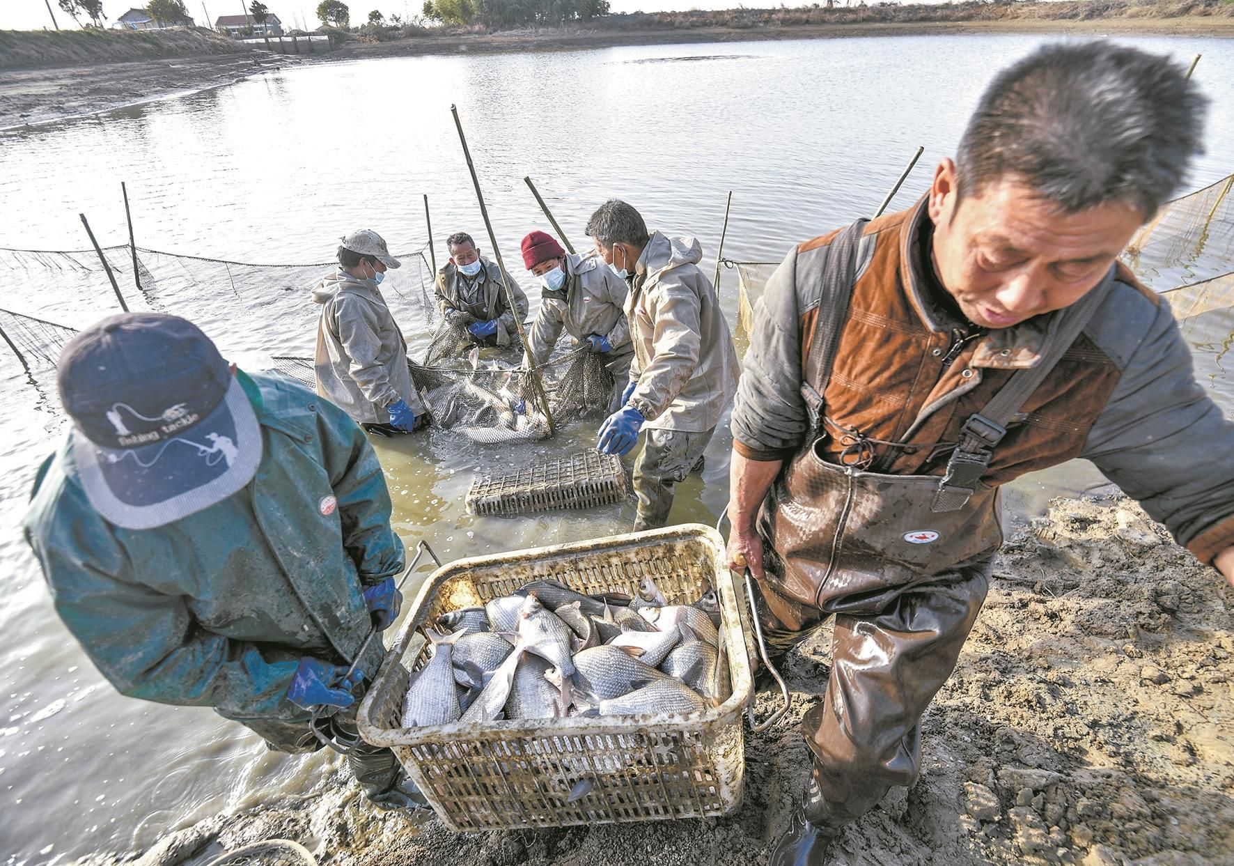基地负责人汪清也是下水网鱼的劳动者之一。“早上7点就撒网了,全部起到岸边至少要一个小时。”汪清告诉记者,春节前是淡水鱼的销售旺季,今年又遇到特殊情况,必须加大春节市场的保供力度,每天的网鱼、分类、运输和销售时间更长了。