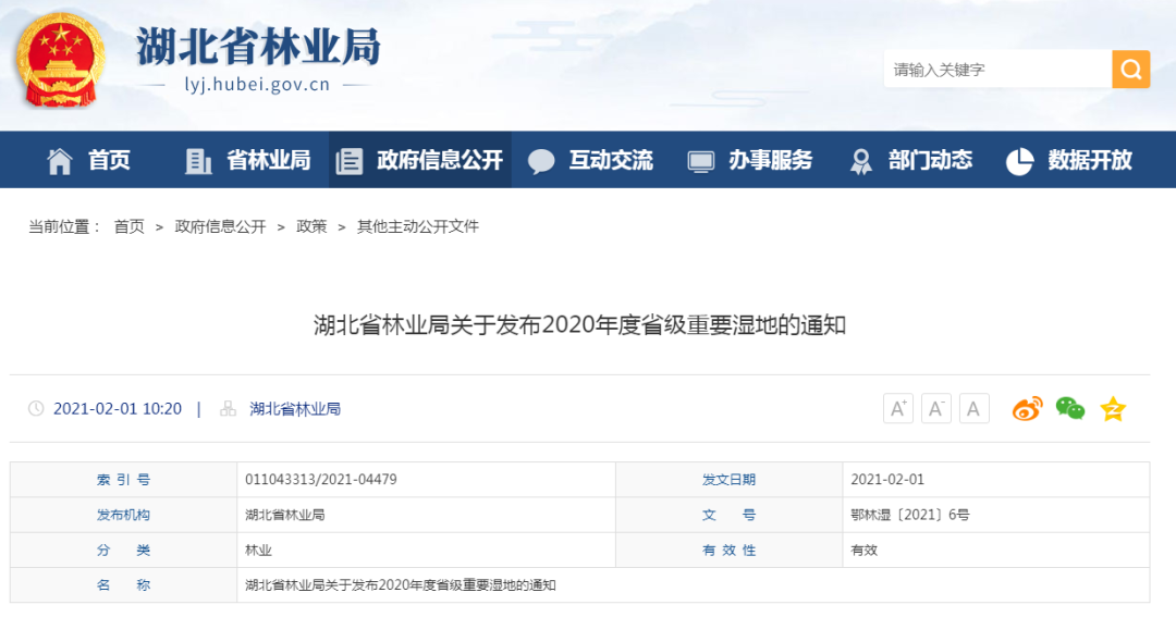 2月1日,湖北省林业局发布一则关于2020年度省级重要湿地的通知。