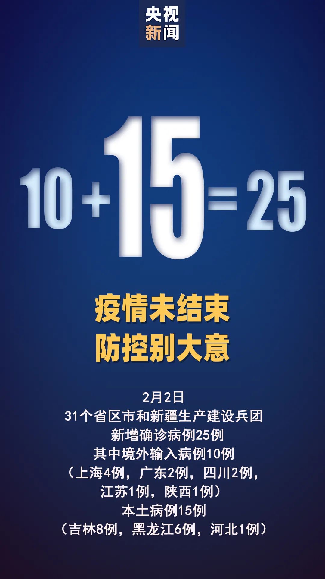 2月2日0时至24时,31个省(自治区、直辖市)和新疆生产建设兵团报告新增本土病例15例(吉林8例,黑龙江6例,河北1例);新增无症状感染者12例(境外输入7例)。