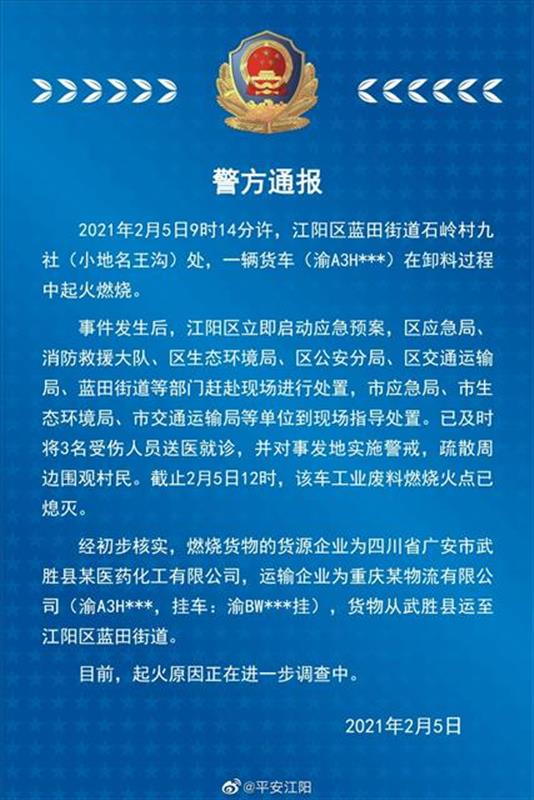 据泸州市公安局江阳区分局通报,2月5日上午9时14分许,江阳区蓝田街道石岭村九社(小地名王沟)处,一辆重庆牌照货车在卸料过程中起火燃烧。事件发生后,江阳区应急局等多部门到现场处置,已及时将3名受伤人员送医就诊,并对事发地实施警戒。5日中午12时,该车工业废料燃烧火点已熄灭。经初步核实,燃烧货物的货源企业为四川省广安市武胜县某医药化工有限公司,运输企业为重庆某物流有限公司,货物从武胜县运至江阳区蓝田街道。目前,起火原因正在进一步调查中。