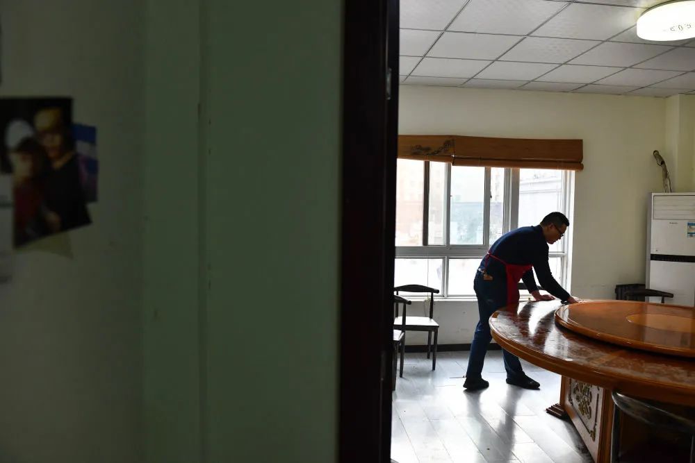 ↑1月30日,张家丰在经营的餐馆内打扫餐桌。