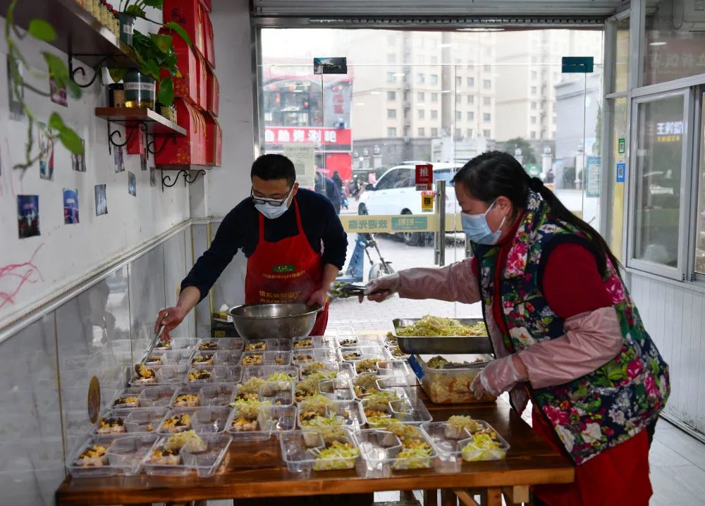 ↑1月29日,张家丰(左)在经营的餐馆内准备盒饭。