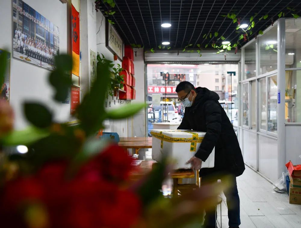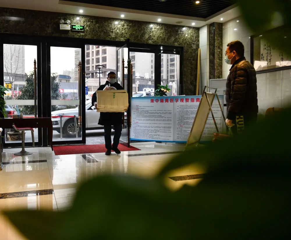 ↑1月29日,张家丰(左)将盒饭运送至当地一家隔离点酒店。张家丰承包了给当地一家隔离点酒店隔离人员提供一日三餐的餐饮项目。