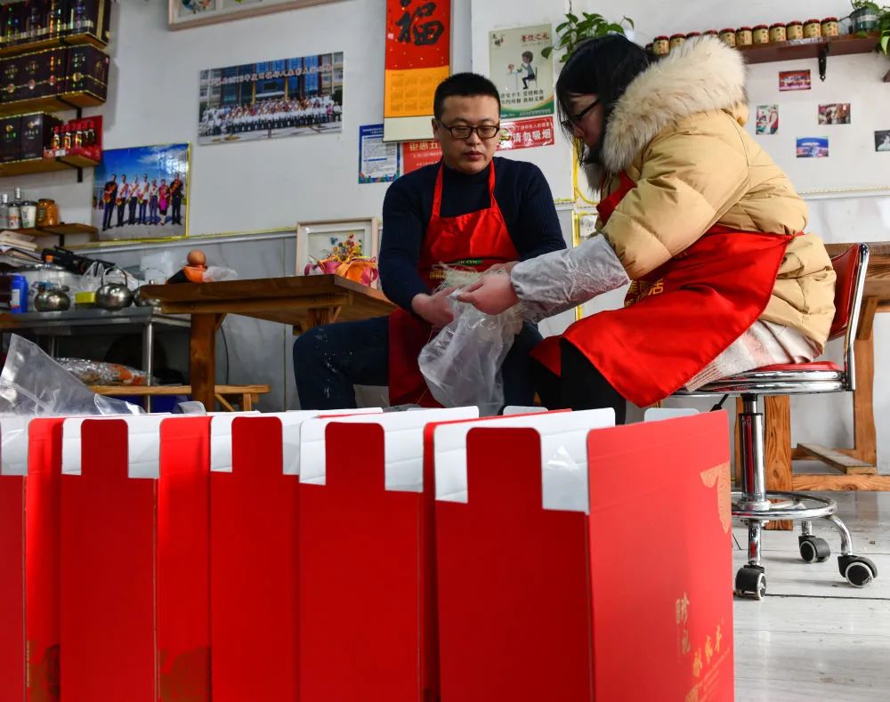 ↑1月30日,张家丰(左)和张晓宇在经营的餐馆内一起打包自家品牌的熟食礼盒。