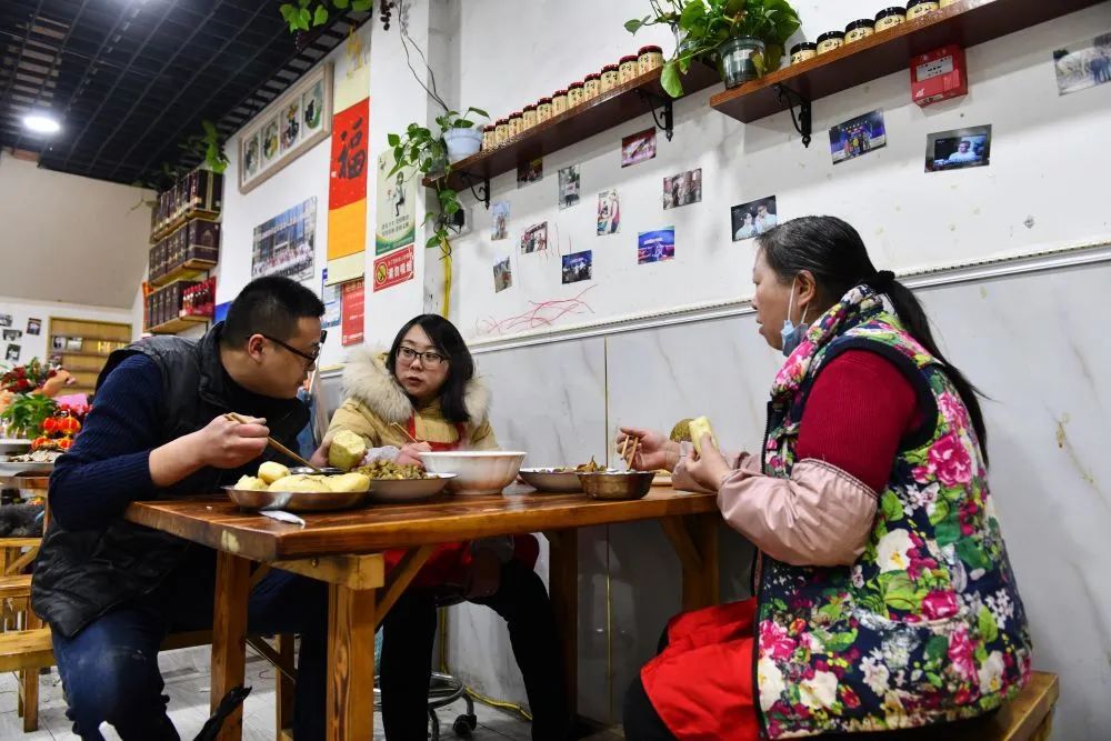 ↑1月30日,经过了一天的忙碌,张家丰(左)和家人在经营的餐馆内吃晚饭。