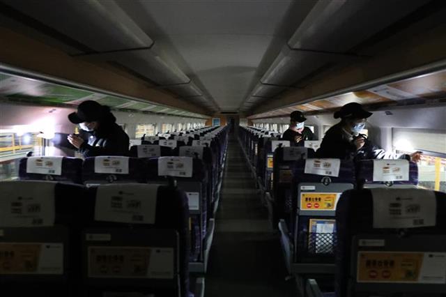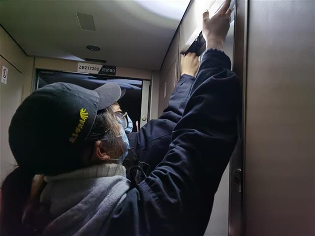 2月1日10时许,记者跟着均是24岁的洪雨佳、马浩然、罗倩登上了停在动车段91道的一辆“复兴号”。因为有其他工种不能带电作业,车厢内开启备用电源,灯光较为昏暗。