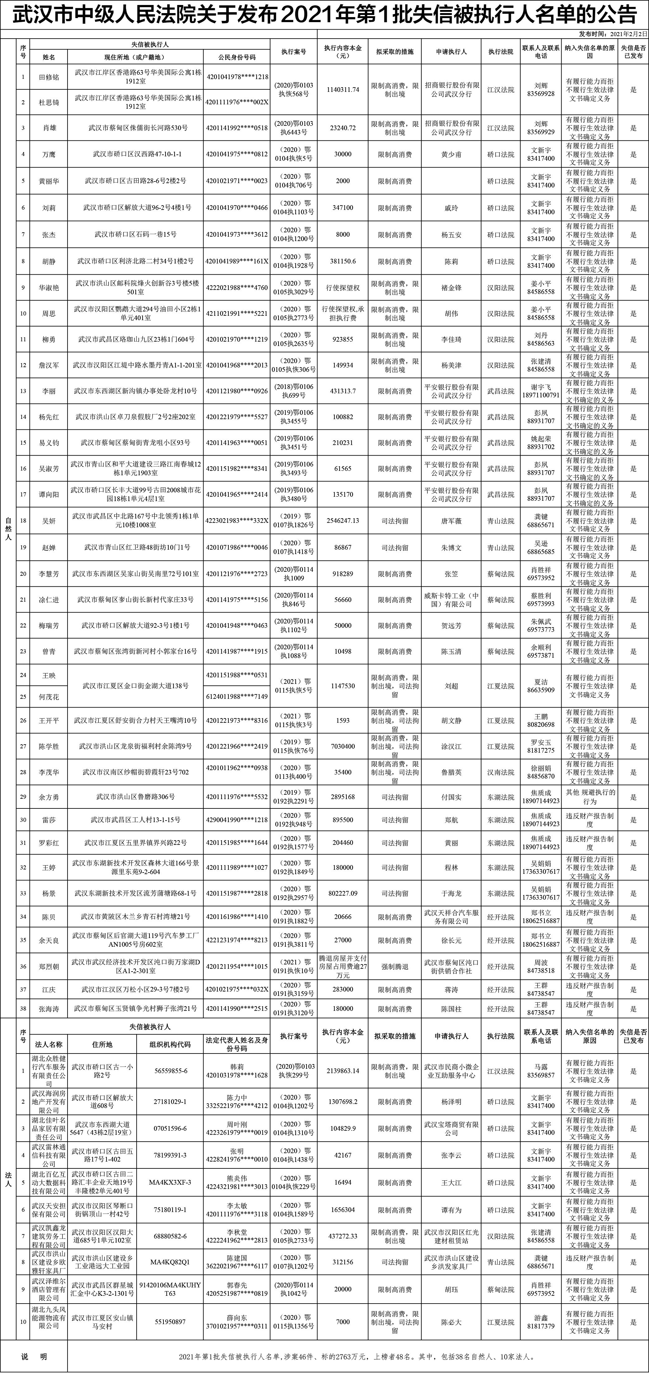 需要特别说明的是,人民法院定期在媒体曝光的失信名单只是失信被执行人名单库的一部分,更多实时失信信息的查询请登录中国执行信息公开网(http://zxgk.court.gov.cn/),“中国执行”“武汉执行”微信公众号“执行公开”栏均可点击进入。失信被执行人履行完法律义务后,法院将依法屏蔽其失信信息,并通过中国执行信息公开网向外推送。