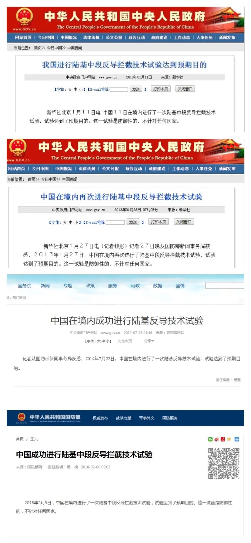 这也是我国第五次对外公开宣布中国进行陆基反导技术试验,此前四次分别发生在2010年1月11日,2013年1月27日,2014年7月23日,2018年2月5日。